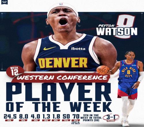 北京时间1月13日,NBA官方公布了第12周的周最佳球员。掘金队侧翼佩顿-沃特森与猛龙队前锋斯科蒂-巴恩斯分别当选上周西部和东部的周最佳球员。这是沃特森生涯首次当选周最佳。这是巴恩斯生涯第二次获得这一奖项。小卡、阿夫迪亚等球星获得提名。